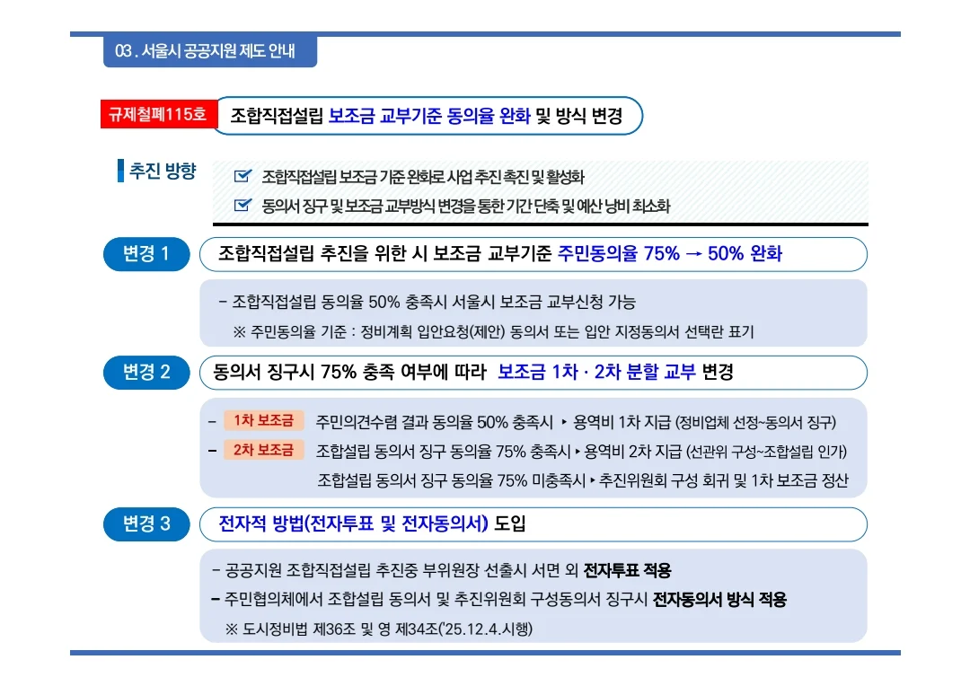 기존에는 조합 직접설립 시 주민 동의율 75%가 필요했지만, 앞으로는 50%만 충족해도 보조금 신청이 가능해졌습니다. 또한 동의서 징구율에 따라 보조금 1차·2차 분할 지급도 도입되어 조합 설립 부담이 크게 줄어들 것으로 기대됩니다.