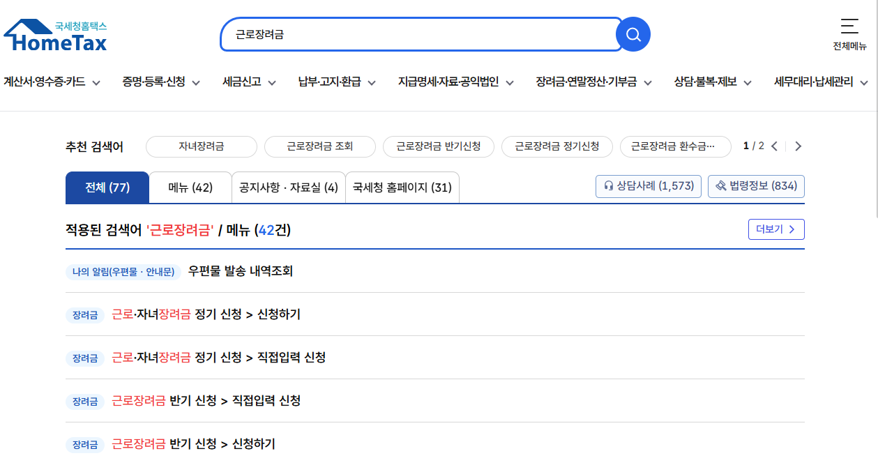 - 홈택스 (www.hometax.go.kr) 로그인 후 '장려금 신청'